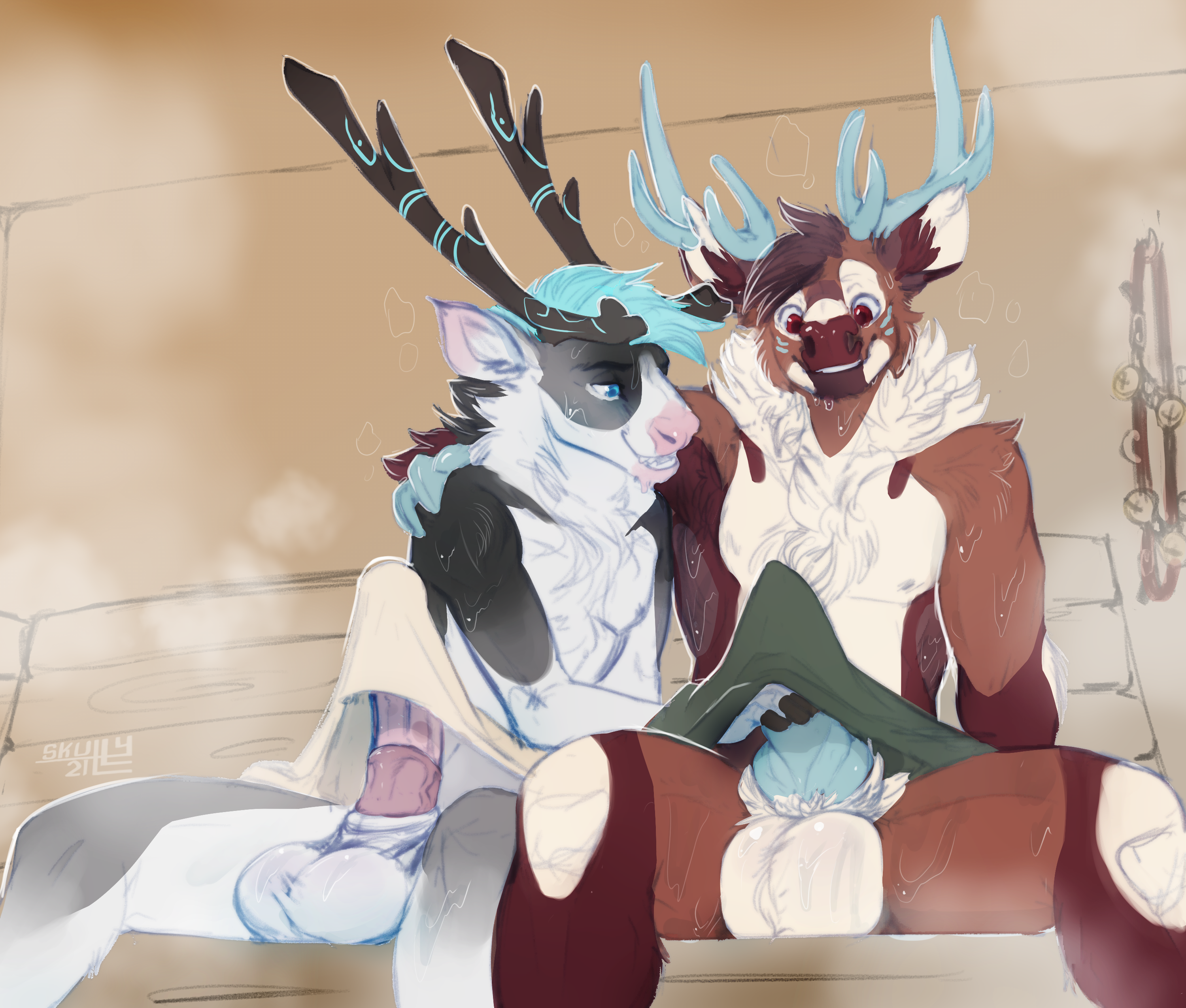 Gearing up for the holiday season, there's a lot of work us antler folk have to do to prep! After a long day of sleigh-pulling, it's best to wind down in the saunas. For the full experience though it's best to bring a friend